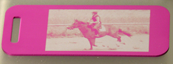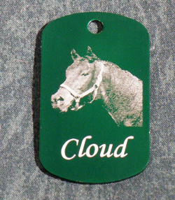 | This is another anodized aluminum dog tag. On this one we left the image background and the picture is inverted so the horses are the darker part of the engraved image. | |