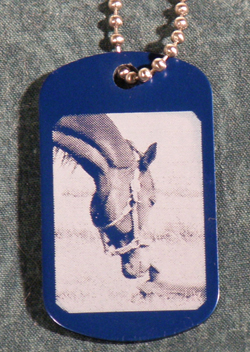 | This is a anodized aluminum dog tag that can be put on a ball chain necklace or split key ring. We deleted the sky background and inverted the image so the horse's head is the darker part of the engraving. It makes for a very unique image. | |