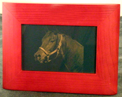 | This is basically the same as above except we engraved the horse on a larger piece of spruce green / gold plastic and placed it in one of our wood picture frames. It makes for a very unique framed picture. | |