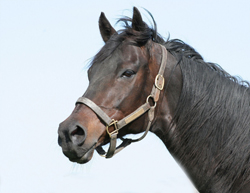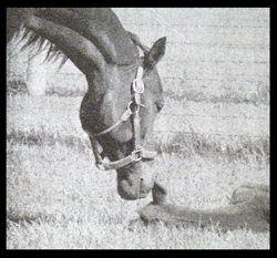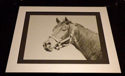 | This is a polished silver picture frame with a black anodized aluminum plate. We laser engraved the image onto the black anodized aluminum plate. We left a small black border around the image which looks like the picture has a matte. Then we inverted our image so the dark spots on the horse is where the black anodized aluminum was left on the plate. The silver around the horse's head is the aluminum showing through after we engraved the black off the plate. If you notice in the original image the picture was taken at an upward angle so the sky is the background. Which makes the horse head the main focal point. Since this horse was dark we left the sky so all the black would be removed around her head. | |