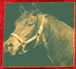 | Again we used the same image as above. Since we used a black / gold piece of plastic the horse's head blended to much with the rest of the plate so we added a little border around the horse's head so it would stand out better. This piece was is a plastic photo image tall plate. It can also be used for a sign or memorial. | |