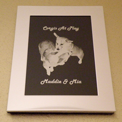 | This is a polished silver picture frame with a black anodized aluminum plate. We laser engraved the image onto the black anodized aluminum plate. On this one we removed the background from the image. There was a lot going on in the background which took away from the dogs (The image below has background so you can compare the difference). Instead of putting a plain background in we left it transparent so it would be black around the dogs. They have a lot of white and if we did the image like the horse head above it would take away from the dogs and with the white feet it didn't really look like they had feet so leaving the black was the best option for this image. | |