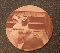 | This is a leather coaster engraved with a picture of my dog. No real changes were made to the image. We just engraved the image on the leather coaster with her head being the focal point of the engraving. | |