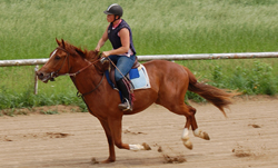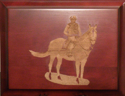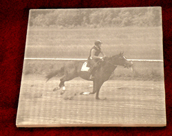 | This is a cherry wood finish plaque / sign. As you can see when you compare the picture to the engraving we cut out a great deal of the background We wanted to make the focal point the horse and rider. Plus there was a dumpster in the background and we didn't feel that enhanced the picture at all.. We had to leave some of the grass as it covered his feet and without it he had no feet which looked bad. | |
