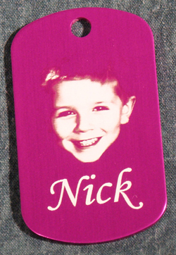 | This item is an anodized aluminum dog tag with a 3d photo image. As you can see we cropped everything in the image but Nick's head and then inverted the image. Then we use a 3D photo engraving setting to make his face the focal point of the engraving. This process works best with a picture of a person's head. If you leave the rest of the image the 3D effect does not turn out very well. Also this process doesn't seem to work as well with animals as they have a lot more going on. How cute is this?!?! |
